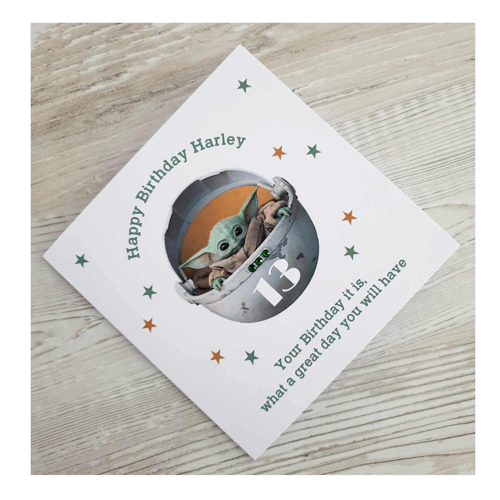 This personalised card is an ideal card for Children, Boys & Girls, Teenagers, even adults who are fans of The Mandalorian and the Star Wars franchise.