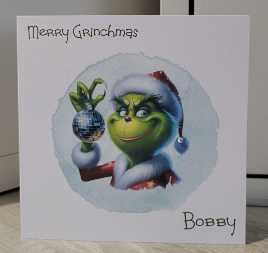 Personalised Glitterball Grinchmas card. Finished with Rhinestones and a Sprinkling of festive glitter.